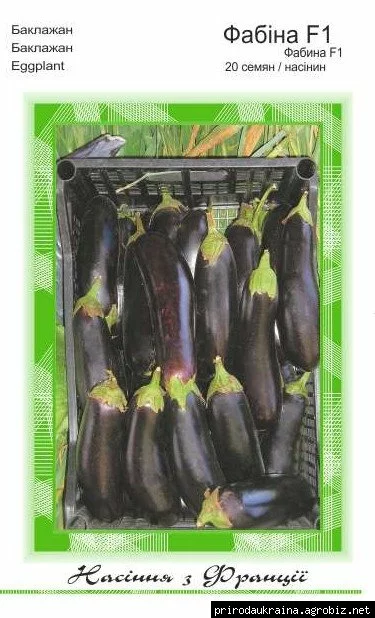 Баклажан Фабіна F1 20 шт– середньоранній, високопродуктивний гібрид французької селекції, представлений насіннєвою компанією Clause. Тривалість вегетаційного періоду – 70-75 днів від пересаджування розсади на постійне місце. Рослина середньоросла, з хорошою енергією зростання, розлога, має рясне листя. Формує приблизно 8-10 плодів, рівних за формою і розміром. Чуйна до внесення прикореневого підживлення. Добре розвивається на зволожених і удобрених ґрунтах, з інтенсивною освітленістю. Відрізняється сильним імунітетом до вертіціллезу і павутинного кліща.