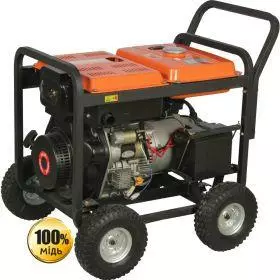 Комплектуется миниэлектростанция транспортировочными колесами и рукояткой (немного выступает из рамы), что создает удобство при ее транспортировке.