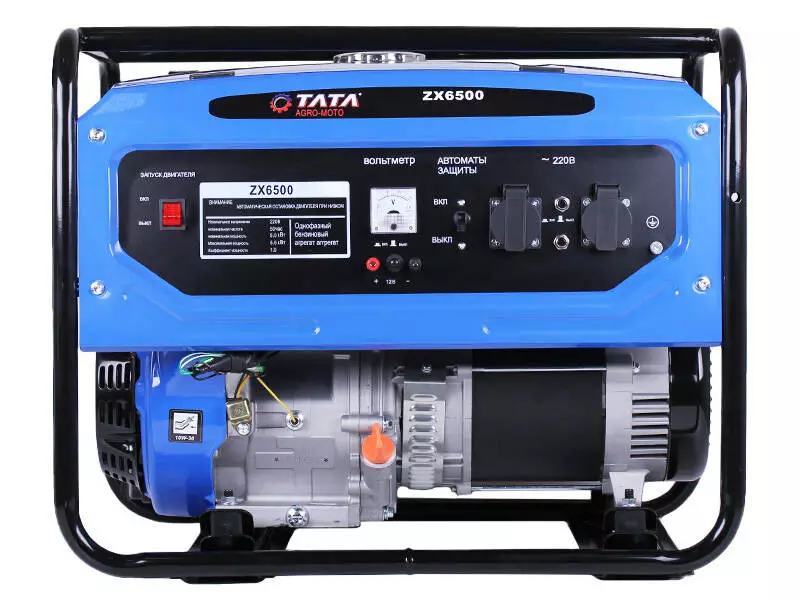 Генератор газ-бензин TATA ZX6500 5KW – устройство, способное вырабатывать электроэнергию за счет сжигания бензина или газа. Мощности модели достаточно для питания любых бытовых приборов, электроинструмента и даже маломощных сварочных аппаратов. Это делает его незаменимым резервным источником для мастерских, СТО, домашних хозяйств, небольших магазинов и кемпингов. Особенности конструкции и использования В качестве силовой установки в данной модели применен мощный 13 л.с. четырехтактный бензиновый двигатель марки 190F. Воздушное охлаждение и ручной стартер максимально упрощают конструкцию и требования к обслуживанию данного ДВС. В качестве преобразователя энергии используется синхронный однофазный электрогенератор переменного тока. Это позволяет использовать его для питания сложной электроники, чувствительной к параметрам электросети. Преимущества модели- Благодаря конструктивным особенностям двигатель ZX6500 способен работать на бензине, сжиженном и природном газе. Это актуально для мощных преобразователей энергии, где потребление топлива достаточно велико.