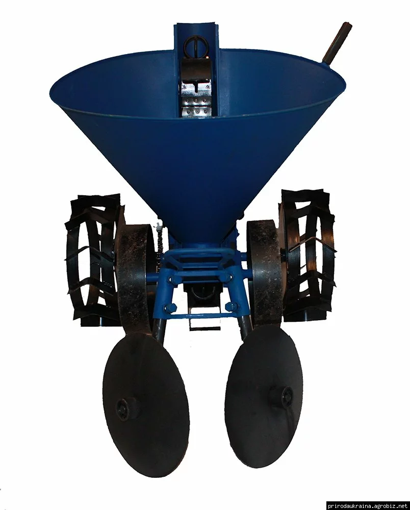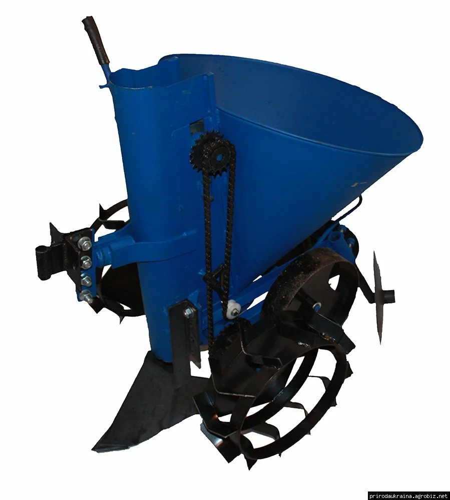 - Включает в себя бункер для клубней, сошник, опорно-приводные колёса, диски для закапывания картофеля и колёса транспортировочные.