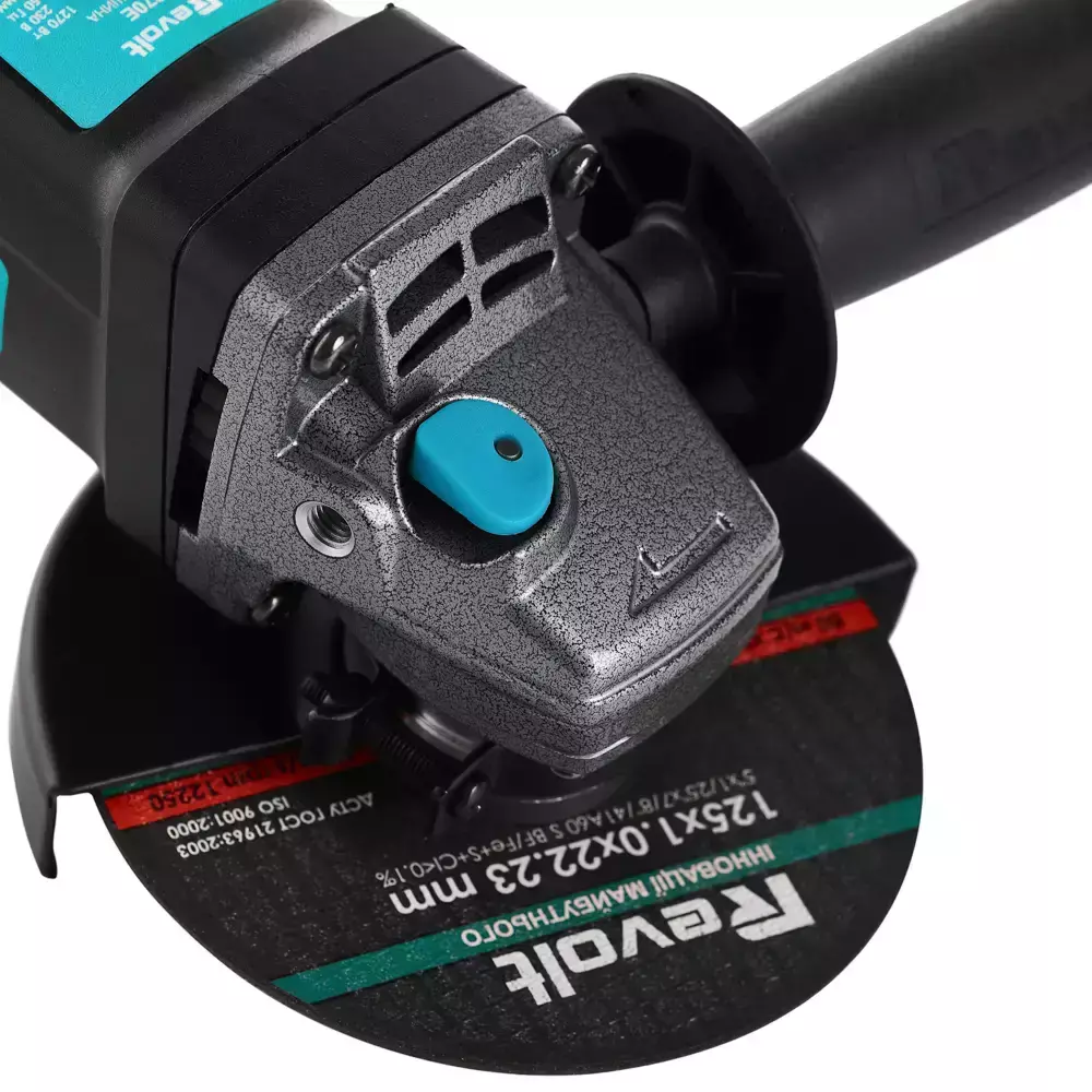 Revolt AG 125-1200 обладнана потужним двигуном, посиленою системою захисту від пилу, ергономічною основною рукояткою, вузькопрофільним корпусом редуктора. Модель має термостійкий і ударостійкий корпус, що додає надійність і комфорт при роботі. Передня рукоятка має можливість встановлюватися в одне з двох отворів в корпусі редуктора зі сплаву з високою теплопровідністю.