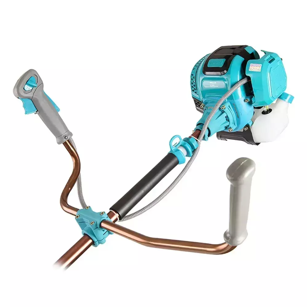 Потужна мотокоса з двотактним мотором потужністю 5.0 кВт оснащена всією необхідною комплектацією, а саме посиленою котушкою, победітовим і трилопатевим ножами. Проста і надійна мотокоса з потужним двигуном 52 см³ легко впоратися з кущами і травою. В комплекті вигнутий диск з победітовими напайками для скошування кущів і високої трави. За рахунок вигнутої форми диск меншою площею стикається з землею, зберігаючи при цьому ріжучі зубці і не втрачає високі обороти.