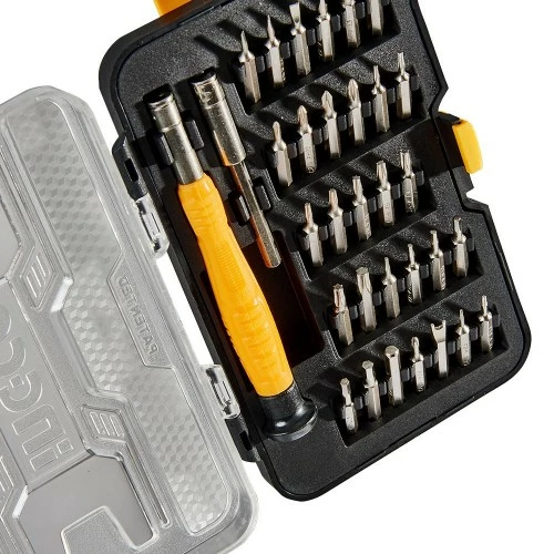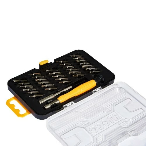 У набір входить 30 біт 4х28 мм розмірів: SL1.5, SL2, SL2.5, SL3, SL3.5, SL4, PH000, PH00, PH0, PH1, T4, T5, T6, T7, T8, T9, T10, T15, T20, H0.9, H1.3, H1.5, H2, H2.5, H3, H4, Y2, U2.6, а також п'ятикутна зірка 0.8 і 1.2, шліц яких підходить для iPhone та iPad.