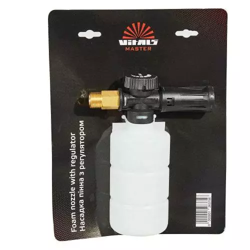 Пінна насадка Vitals Master для мийок високого тиску формує якісну інтенсивну піну, яка легко і рівномірно наноситься на оброблювану поверхню. Насадка з'єднується з пістолетом за допомогою нарізного сполучення. На пінної насадки реалізована регулювання дозування миючого засобу для максимально ефективного використання в будь-яких умовах і на різних поверхнях.