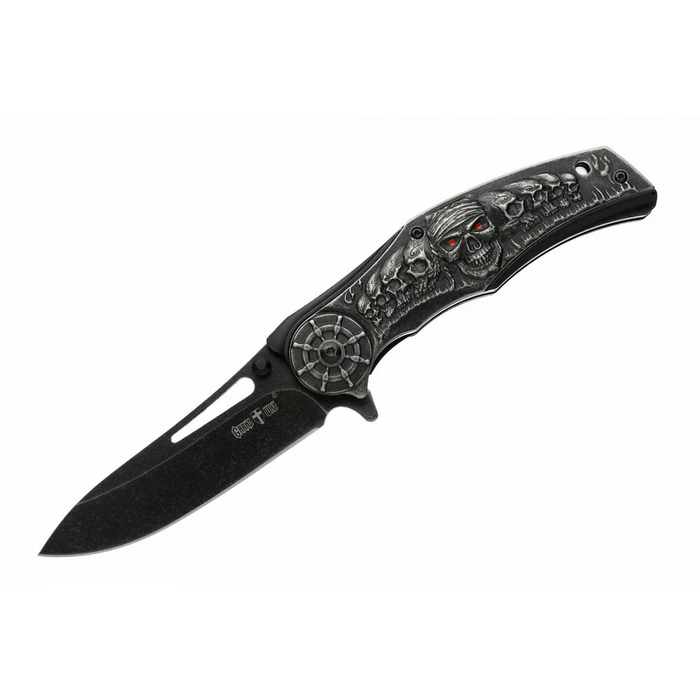 Рукоять – стальные пластины-лайнеры с пластиковой и алюминиевой накладками. На ноже 18037 имеется клипса, с которой его удобно носить на кармане джинсов, брюк и прочей одежды. Накладки рукояти украшены объёмными изборажениями штурвала и черепа в лихой пиратской косынке. Естественно, тут прослеживается прямой намёк на фильм "Пираты карибского моря" и прочие пиратские истории, издавна любимые мальчишками и юношами по всему миру.