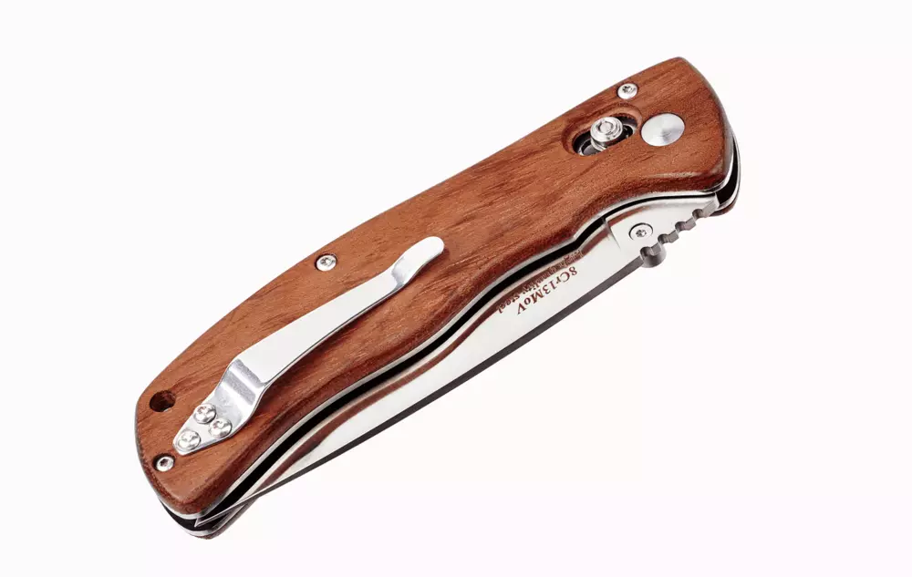 Древесина, используемая для изготовления накладок, прошла специальную обработку и устойчива к влаге, гниению и вредителям. Теплые на морозе и приятные на ощупь накладки имеют красивую текстуру и замечательно смотрятся. Шпеньки на клинке обеспечивают открытие ножа одной рукой, а симметричный дизайн будет одинаково удобен и правшам и левшам. Наличие клипсы обеспечивает удобное постоянное ношение ножа с собой. Превосходная модель со свежим дизайном и превосходным резом.