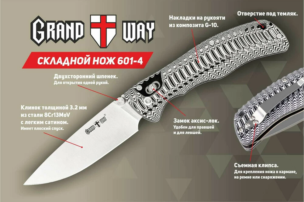 Нож складной Grand Way 601-4 - cовременный складной нож с клинком из высококачественной нержавеющей стали, дополнительно легированной молибденом и ванадием.
