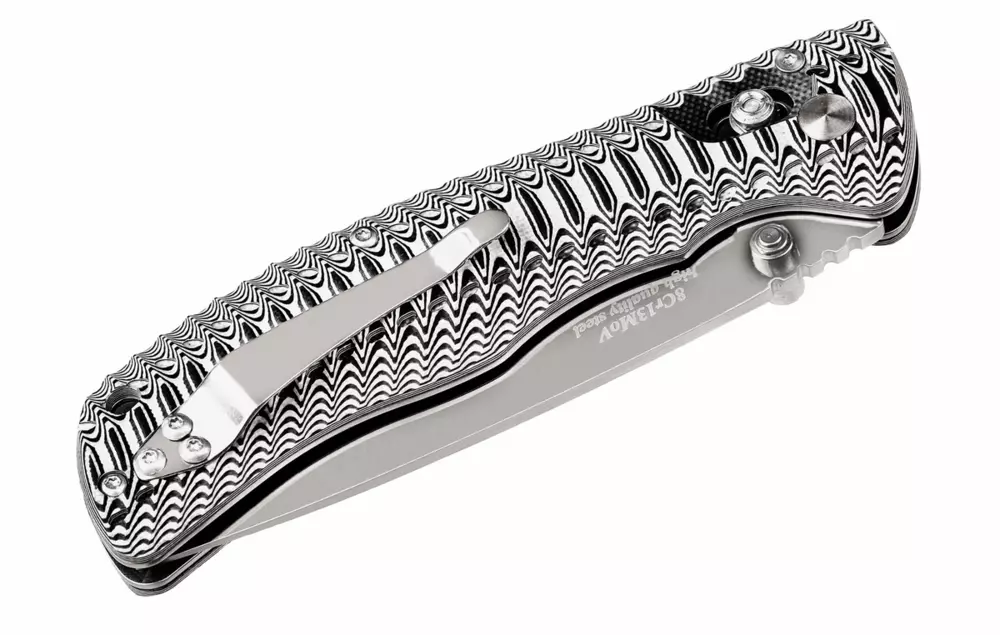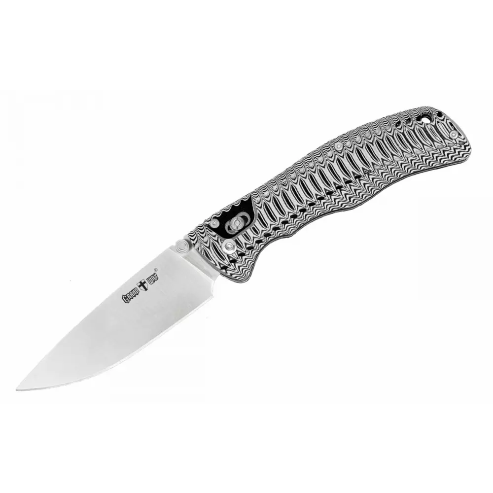 Накладки рукояти изготовлены из не впитывающего влагу композитного материала G 10. Этот прочный композит обладает долговечностью и устойчивостью к влаге. Рукоять приятна на ощупь и не скользит даже в мокрой руке, обеспечивая комфортное удержание ножа. Ребристая фактура рукояти имеет элегантную черно-белую расцветку, придающую ножу эффект 3D и неповторимый внешний вид.