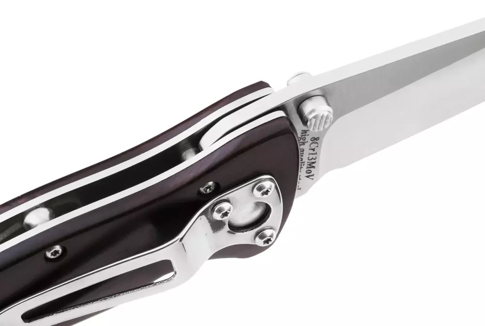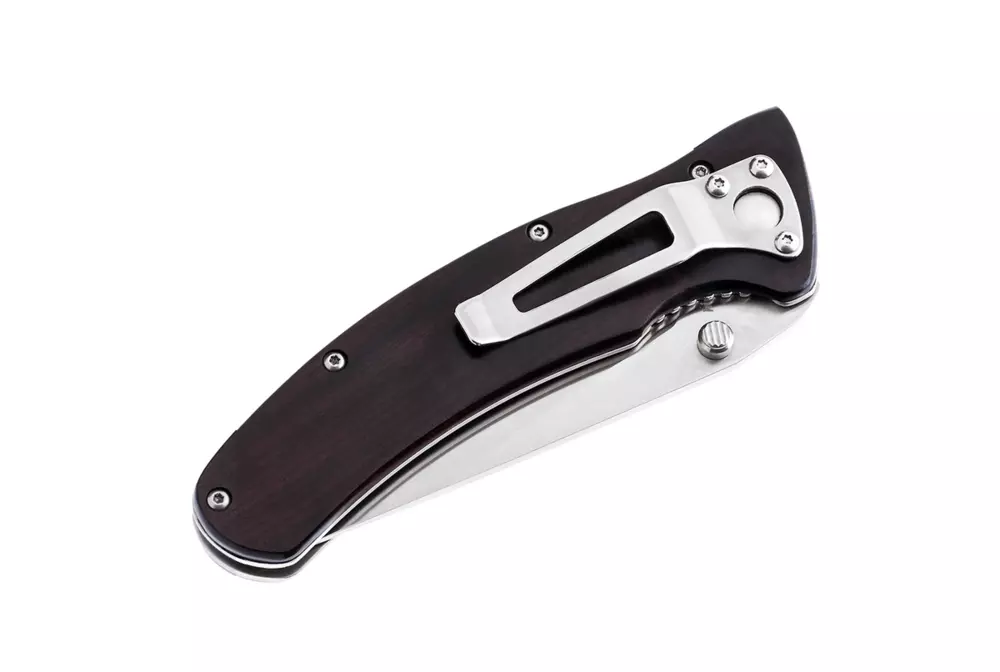 Прочному складному ножу нужен надежный замок – в этом ноже это хорошо себя зарекомендовавший линейный замок «Liner Lock». Замок надежен в своей простоте, отработан в производстве и крайне неприхотлив. Особая эргономичная форма рукояти удобна и безопасна в работе. Накладки на рукояти изготовлены из красивого и прочного черного дерева. Древесина, используемая для изготовления накладок, прошла специальную обработку и устойчива к влаге, гниению и вредителям. Теплые на морозе и приятные на ощупь накладки глубокого темного цвета эффектны и долговечны. Шпеньки на клинке и конструкция замка позволяют открывать и складывать нож одной рукой. Наличие клипсы обеспечивает удобное постоянное ношение ножа с собой.