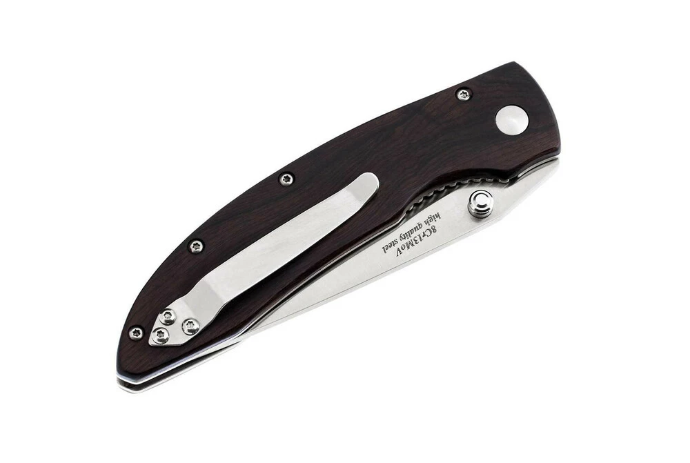 Прочному складному ножу нужен надежный замок – в этом ноже это хорошо себя зарекомендовавший линейный замок «Liner Lock». Замок надежен в своей простоте, отработан в производстве и крайне неприхотлив. Особая эргономичная форма рукояти удобна и безопасна в работе. Накладки на рукояти изготовлены из красивого и прочного черного дерева. Древесина, используемая для изготовления накладок, прошла специальную обработку и устойчива к влаге, гниению и вредителям. Теплые на морозе и приятные на ощупь накладки глубокого темного цвета эффектны и долговечны. Шпеньки на клинке и конструкция замка позволяют открывать и складывать нож одной рукой. Наличие клипсы обеспечивает удобное постоянное ношение ножа с собой.