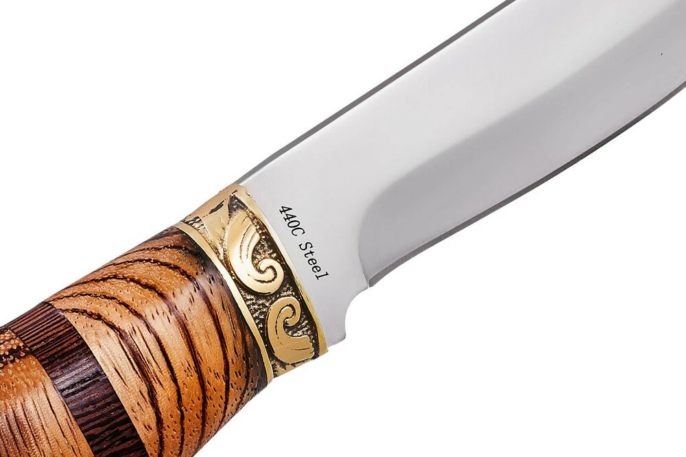 Нож охотничий фиксированный Grand Way 1022 – это классическая, но интересно декорированная модель с клинком из нержавеющей стали марки 440 С, которая после термообработки получила параметры твердости в диапазоне 57-58 единиц по Роквеллу. При этом клинок довольно гибок и успешно противостоит и нагрузкам на излом, и ударным нагрузкам.