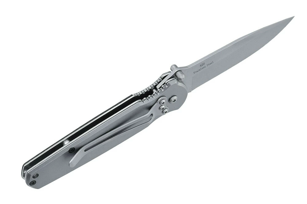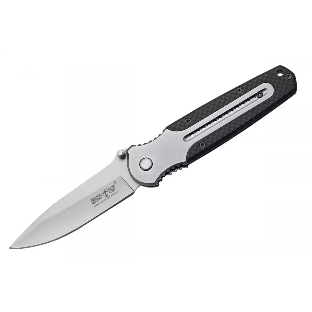 Нож складной Grand Way 01609 оригинального дизайна с клинком из 420 стали. Сталь марки 420 - это отработанная в производстве нержавеющая сталь бюджетного сегмента. Относительно небольшое содержание углерода делает эту сталь вязкой и исключительно стойкой к ржавчине. Небольшое содержание углерода также положительно влияет и на прочность: такая сталь менее хрупкая. Возможно лезвия таких ножей тупятся чуть быстрее более дорогих марок, но и точится она тоже очень легко и буквально на всем: мусаты, любые точильные камни и даже V-образные точилки без усилий приведут затупившийся нож в боевую форму без затруднений, а твердости хватит с избытком для бытовых задач.