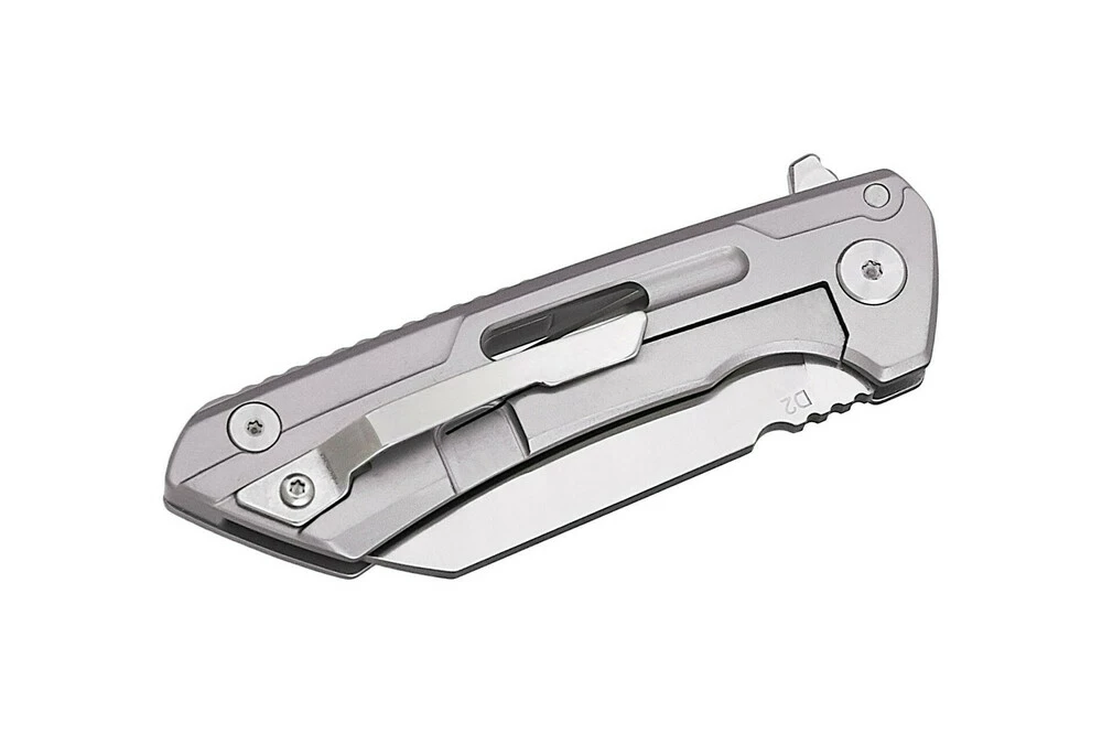Пред нами складной нож с полированной цельнометаллической рукоятью из нержавеющей стали марки 420 и клинком из D2. Тип раскрытия клинка – флиппер. Замок – фрейм лок, что опять-таки, среди ножей по такой цене встретишь не так уж и часто.