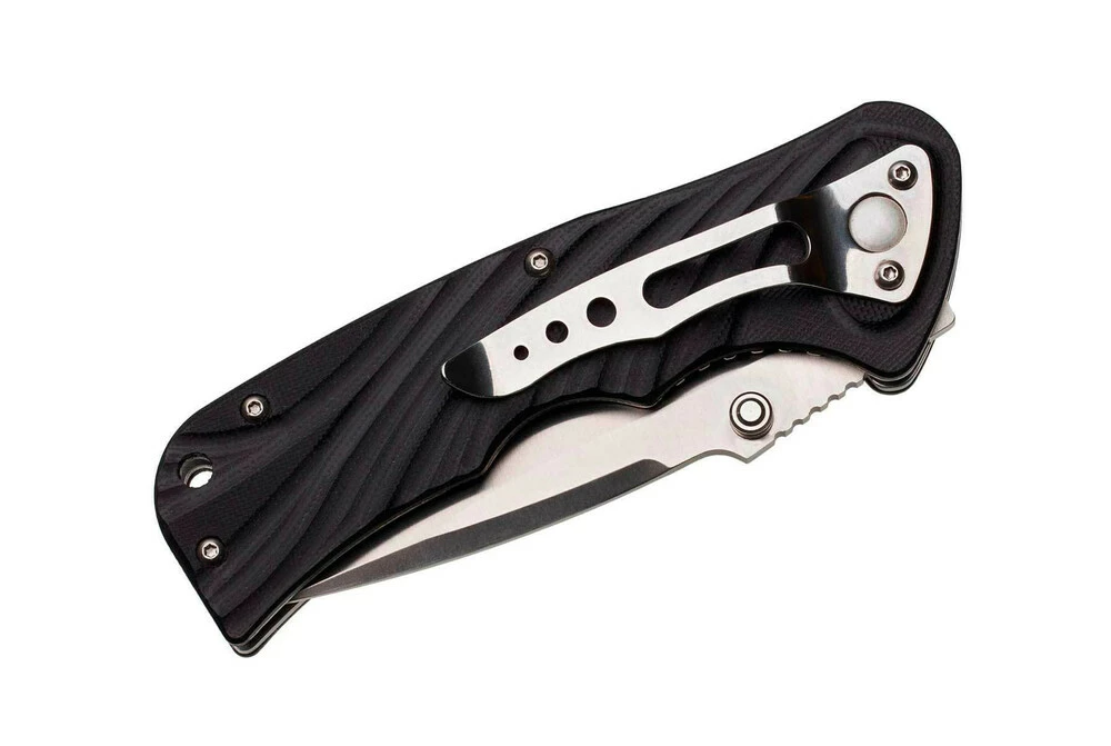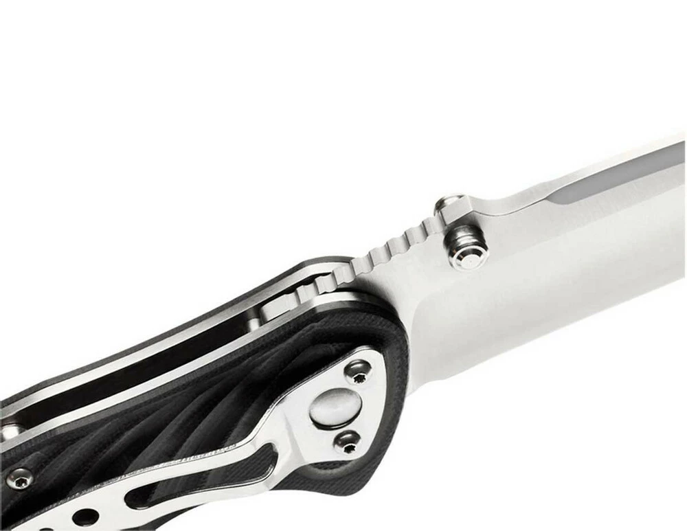 Прочному складному ножу нужен надежный замок – в этом ноже это хорошо себя зарекомендовавший линейный замок «Liner Lock». Замок надежен в своей простоте, отработан в производстве и крайне неприхотлив. Уникальная эргономичная форма рукояти безопасна в работе, благодаря насечкам и 3d обработке накладок. Накладки рукояти изготовлены из композитного материала G-10 черного цвета - стеклопластика высокого качества. Композиция фенольных смол и стекловолокна обладает замечательной прочностью, маслобензостойкостью, устойчивостью к влаге, не проводит электрический ток, долговечна и технологична. Шероховатые текстурированые накладки из G-10 приятны на ощупь и не скользят даже в мокрой руке. Шпенек на клинке, а также конструкция замка позволяют открывать и складывать нож одной рукой. Наличие клипсы обеспечивает удобное постоянное ношение ножа с собой.