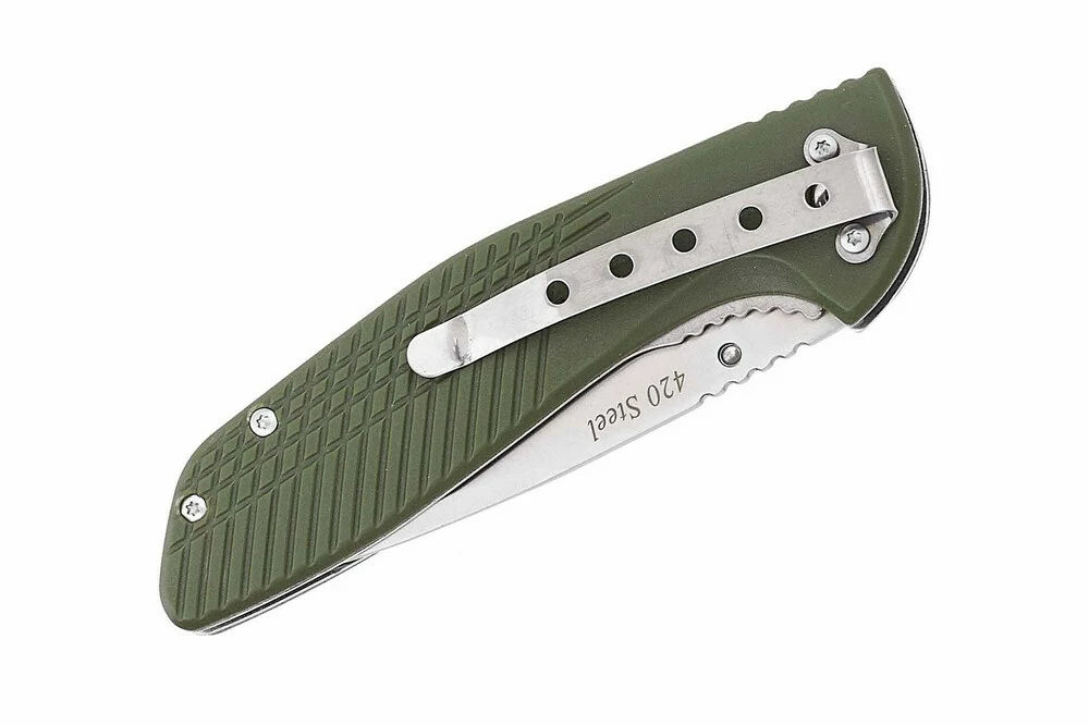 Имеется насечка и на обухе клинка, изготовленного из нержавеющей стали марки 420. Применение недорогой нержавейки и пластика, пожалуй, единственная причина, по которой этот нож так удивительно недорог. Хотя, если учесть, что 420-я фактически не ржавеет и очень легко точится, можно сказать, что и у неё есть свои преимущества перед более дорогими и твёрдыми сталями.