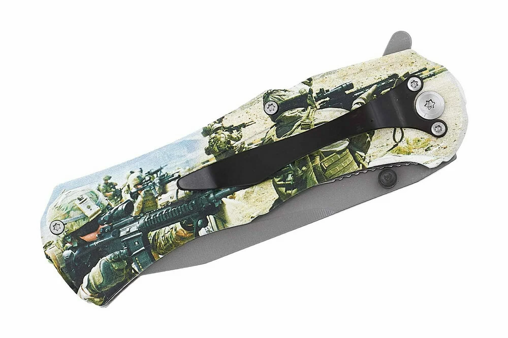 Плашки рукояти украшены рисунком в стиле милитари. Довольно чётким и качественным. На правой стороне в районе осевого механизма расположена в меру тугая, аккуратная «tip-up» клипса.