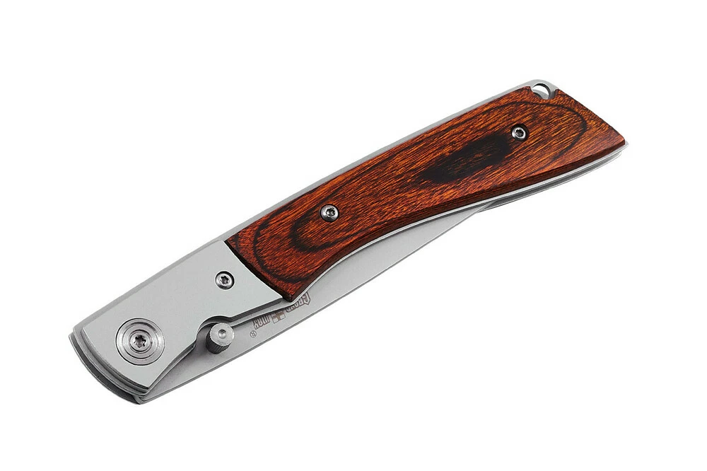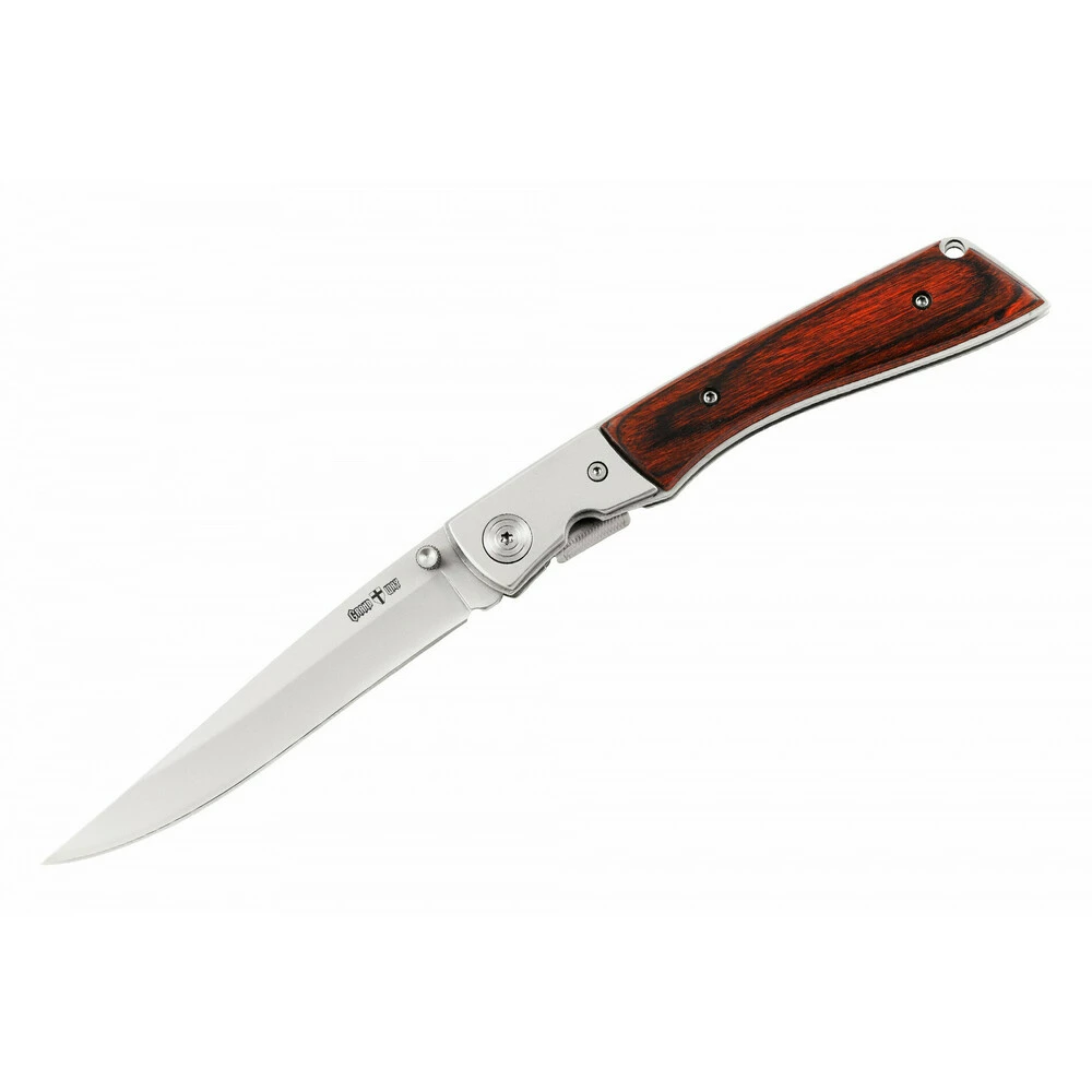 Не нравятся маленькие перочинные ножики, которыми сложно отрезать кусок хлеба, но и не нравятся крупные массивные ножи? С этой моделью таких проблем не будет. Нож большой и одновременно легкий и элегантный. Длинный клинок, аккуратная рукоять простой, но продуманной формы с деревянными накладками прекрасно лежит в руке. Древесина прошла специальную обработку и не боится влаги. Сама рукоять изготовлена из толстых стальных пластин и скреплена прочными винтами.Для дополнительной прочности, у регулируемого осевого винта, имеются металлические больстеры.