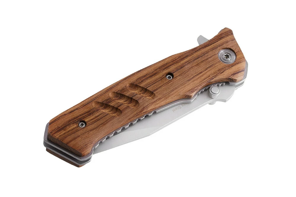 НОЖ СКЛАДНОЙ GRAND WAY E-57 с деревянными накладками и упором на клинке из 420 стали. Сталь марки 420 - это отработанная в производстве нержавеющая сталь бюджетного сегмента. Относительно небольшое содержание углерода делает эту сталь вязкой и исключительно стойкой к ржавчине. Небольшое содержание углерода также положительно влияет и на прочность: такая сталь менее хрупкая. Возможно, лезвия таких ножей тупятся чуть быстрее более дорогих марок, но и точится она тоже очень легко и буквально на всем: мусаты, любые точильные камни и даже V-образные точилки без усилий приведут затупившийся нож в боевую форму без затруднений, а твердости хватит с избытком для бытовых задач.