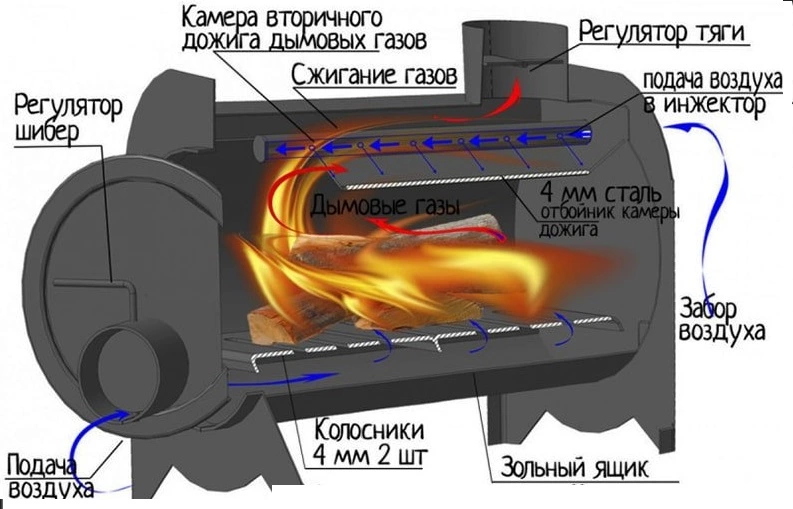 Пічка має камеру подвійного дожига на колосниковій решітці.