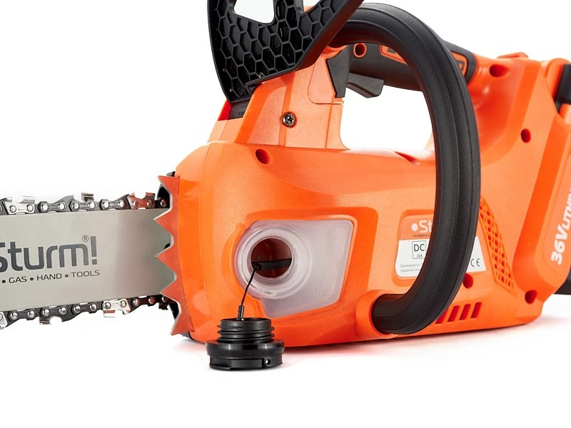 Цепная пила работает от аккумуляторной батареи Sturm CL203B (в комплект не входит), которую можно использовать с другими устройствами из линейки Sturm 36В.