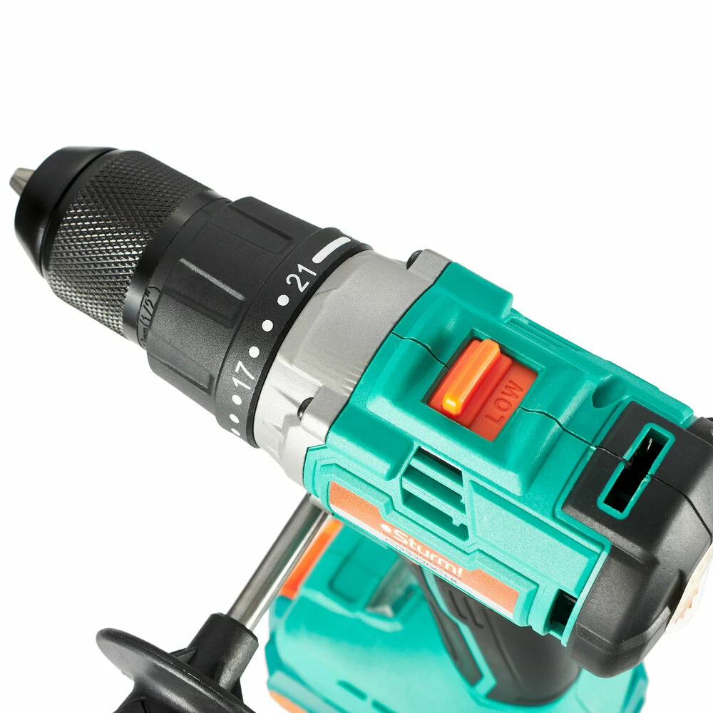 Шуруповерт акумуляторний Sturm CD3220CLB Brushless – суперпотужний акумуляторний 20-вольтовий двошвидкісний шуруповерт з лінійки інструменту Sturm під єдину акумуляторну платформу. З'явившись у 2022 році, Sturm CD3220CLB поряд з моделями Sturm CD3220CLI, Sturm CD3220BLI представляє нове покоління шуруповертів Sturm – у ньому зібрані всі значні переваги моделей попередніх років. Одна з найбільш важливих особливостей - потужний безщітковий електромотор - за рахунок нього збільшується стійкість до перевантажень і забезпечується краща продуктивність роботи на одному заряді АКБ, крім того, такий мотор не схильний до перегріву і дозволяє довше працювати без перерви. Завдяки двошвидкісному планетарному редуктору підвищеної міцності, шуруповерт демонструє, як для моделі DIY сегмента, дуже високі показники по моменту, що крутить (макс. крутний момент - 60 НМ). Величезне оснащення пристрою, що включає швидкозатискний металевий 13 мм патрон, функцію блокування валу шпинделя, електронне гальмо вибігу двигуна, ефективне LED підсвічування з нижнім розміщенням і навіть штатну додаткову рукоятку - дозволяють охарактеризувати інструмент, як універсальний, що підходить для будь-яких видів робіт. Комфорт користування гарантують продумана ергономіка та вивірені масово-габаритні показники. На відміну від старшої моделі Sturm CD3220CLI – у даній моделі немає ударного механізму, що виключає режим ударного свердління.