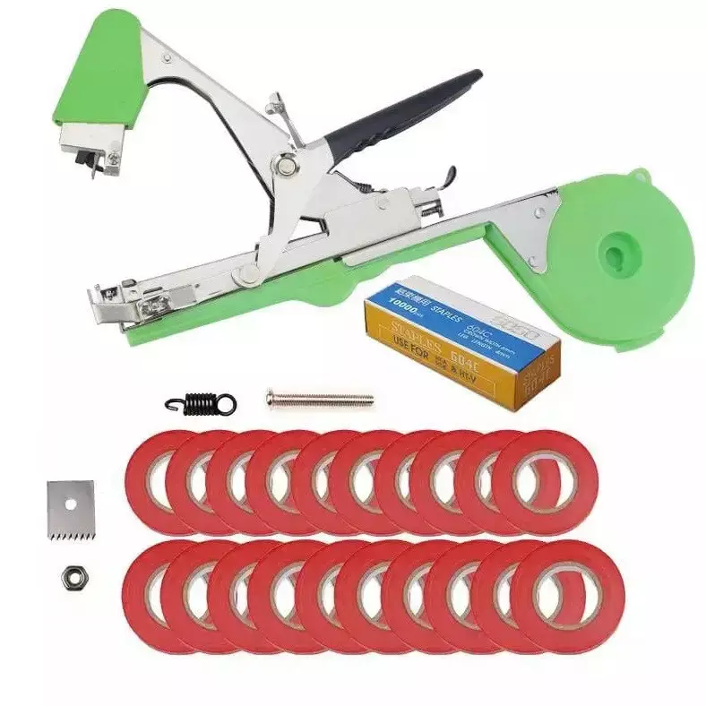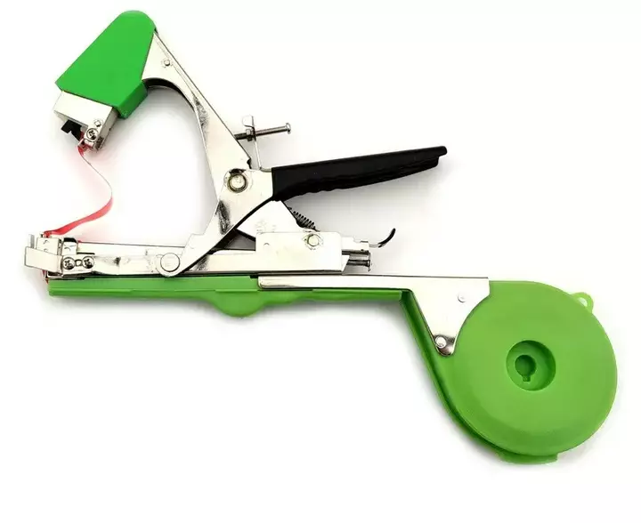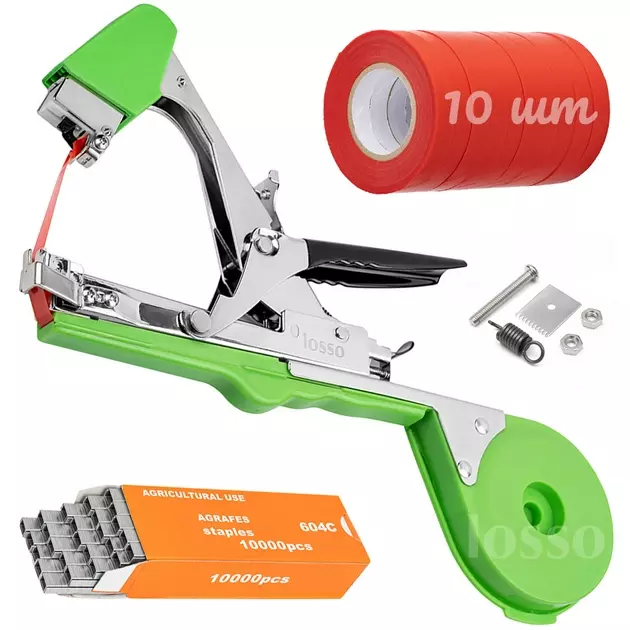 тапенером та стрічкою робить операцію з підв’язки рослин дуже