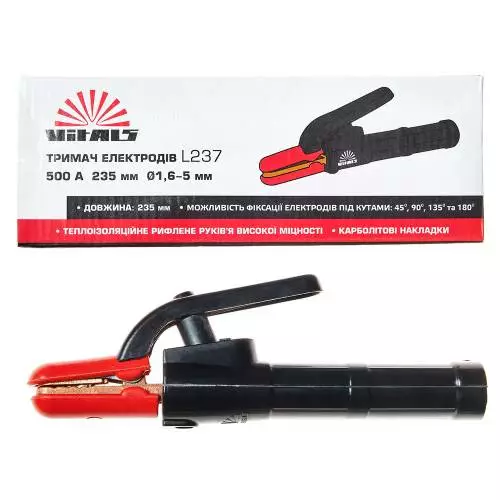 Тримач електродів Vitals L237 500A призначений для надійної фіксації електродів під час роботи під кутами: 45°, 90° та 180°. Робочий струм становить 500 А. Є можливість швидкої заміни електрода.