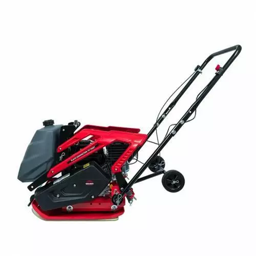 Складывающаяся ручка и узел для подъема в виде рамы над двигателем позволяет без проблем транспортировать устройство даже в легковом автомобиле. Также для удобства транспортировки данная вибрационная плита оборудована транспортировочными колесами. В комплект входит свечной ключ и полиуретановый коврик.