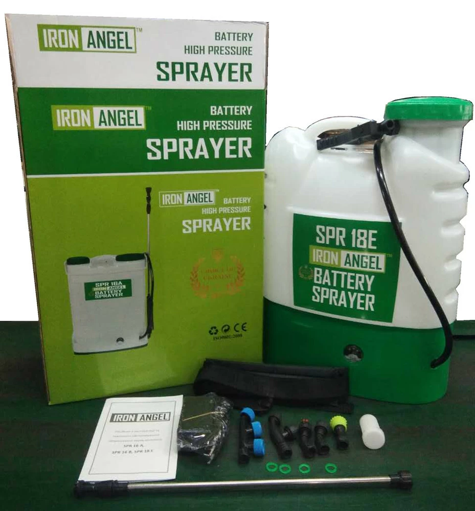 Акумуляторний обприскувач Iron Angel SPR 18Eплечовий електричний обприскувач з об'ємом бака на 18 літрів. Дозволяє швидко і без проблем переміщатися своєю ділянкою, і дістати за допомогою збільшеної довжини розпилювача і шланга майже будь-яке місце.