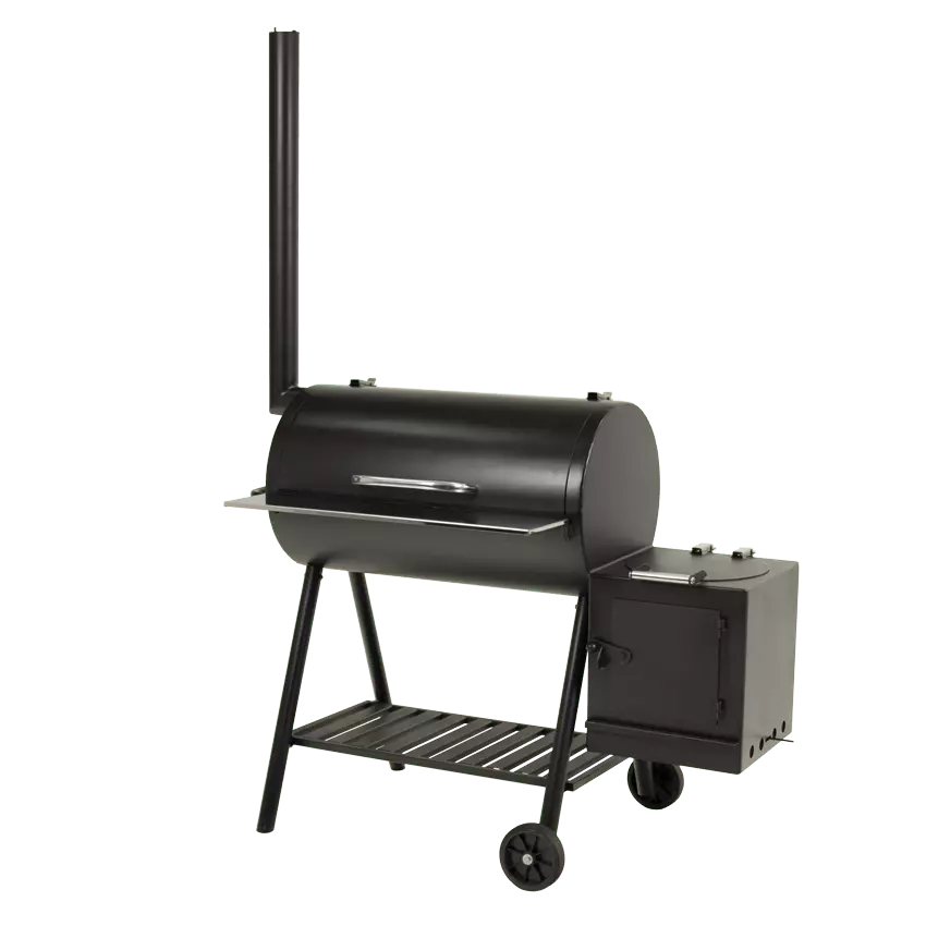 Отвор для казана в печі діаметром 290мм зі зручною відкидною кришкою. Її розмір 360х360х400. Піддувало в нижній частині печі є також і піддувалом для гриля. Дверний проріз печі 230х230. Для режиму смокера передбачено змінне днище зі сталі 1,5мм з отворами різного діаметру, для більш рівномірного розподілу диму та температури в процесі копчення. Для копчення необхідно встановити це днище замість стаціонарного, на решітки розкладається замаринований продукт, а в печі розпалюється вугілля. При досягненні необхідної температури зверху на вугіллі засипають зволожену тріску. Час копчення підбирається за рецептом, залежно від продукту (тип, розмір, об'єм). У смокер-барбекю не фарбується, щоб фарба не попадала на продукти. Перед першим використанням рекомендується змастити гриль зсередини (кришку) соняшниковою олією. Для очищення барбекю з лівого боку мангала є дверцята. Зручна ручка і колеса дозволять переміщати мангал по вашій ділянці. установки посуду з продуктами та нижня полиця з чорного металу для вугілля або інвентарю.