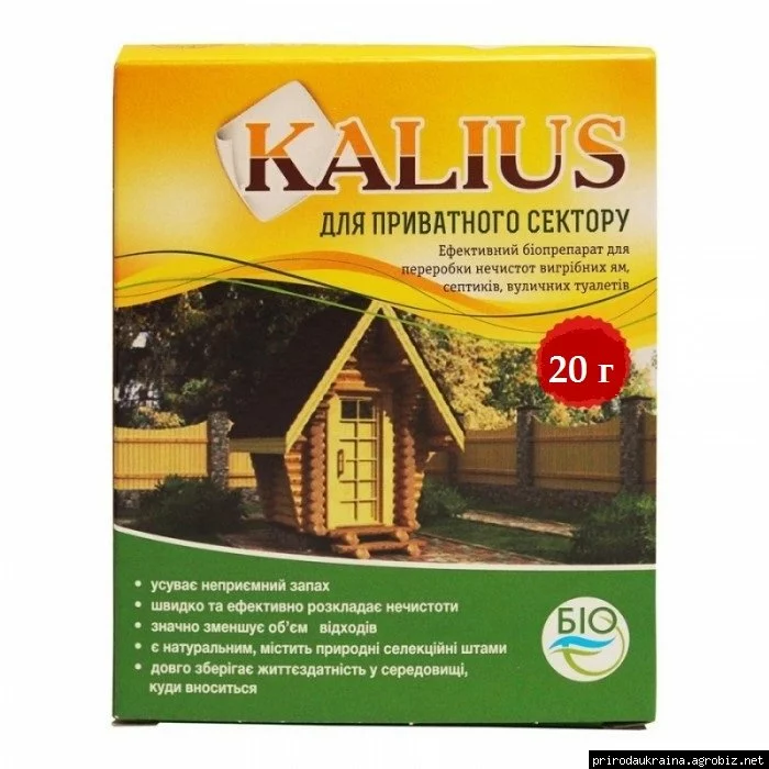 Біоактиватори, біодеструктори,біосептики — так називають біопрепарати для очищеннявигрібних ям, септиків, стічних вод, розроблені для утилізаціїорганічних забруднень та відходів життєдіяльності людини.Біодеструктор «KALIUS» отримано шляхом вирощування спеціальнихбактерій Bacillus subtilis і Bacillus licheniformis, потімвисушування в особливих умовах з додаванням поживних речовин іматеріалів. p>Переваги