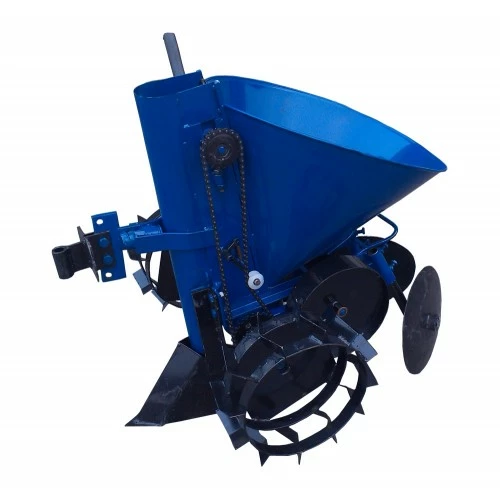 Картоплесаджалка мотоблочна К-1Л — надійний і зручний помічник для посадки картопля в один ряд. Має регулювання відстані між бульбами, глибини посадки та висоти гребінця. Привід обертання для посадки картопля здійснюється через ланцюг від ґрунтозацепів. Ложечки для укладання картопля розташовані на міцній стрічці.