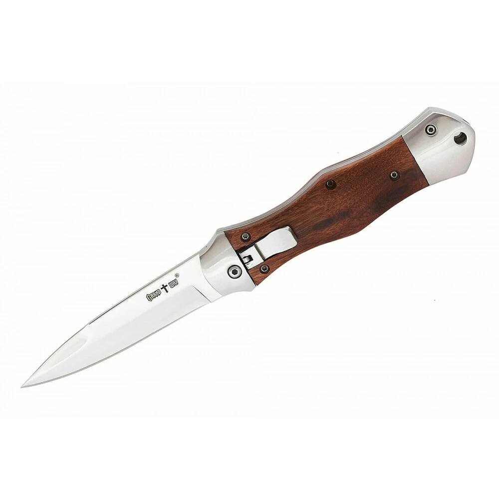 Ніж доладний Grand Way 3051 з бічним викидом клинка. Сталь клинка – 440С. Твердість 58-59 HRC. Має клінок кінжально-списовидний (spear point), що наближає його до стілету. Надійний механізм викиду BUTTON LOCK.