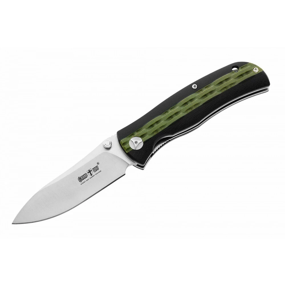 Ніж складаний Grand Way 508 зчасовий складаний ніж з клинком з високоякісної нержавіючої сталі, додатково легованою молібденом та ванадієм. Збалансований склад сталі марки 8Cr13MoV забезпечує тривалу роботу без заточування, хорошу стійкість до іржі та високу міцність, а якісне заводське заточування клинка – впевнений різ. Ця модель була випущена за проектом компанії Grandway. Продумана геометрія клинка, загартованого до 59 HRC, має чудове поєднання міцності і гарного різу. Приємна вага ножа утворена міцними сталевими плашками рукояті і масивною фурнітурою, що скріплює клинок і міцну рукоятку. Відкрита конструкція рукояті на гвинтах дозволяє легко регулювати ніж, ремонтувати і чистити. міцному складаному ножу потрібен надійний замок – у цьому ножі це добре себе зарекомендував лінійний замок «Liner Lock». Замок надійний у своїй простоті, відпрацьований у виробництві та вкрай невибагливий. Накладки рукояті виготовлені із композитного матеріалу G-10. G-10 – склопластик високої якості. Композиція фенольних смол і скловолокна має чудову міцність, маслобензостійкість, стійкість до вологи, не проводить електричний струм, довговічна і технологічна. Шорсткі двокольорові накладки з G-10 приємні на дотик і не ковзають навіть у мокрій руці, а 3d обробка рукояті забезпечує комфортне утримання ножа і неповторний зовнішній вигляд. Шпеньки на клинку та конструкція замку дозволяють відкривати та складати ніж однією рукою. Наявність кліпси забезпечує зручне постійне носіння ножа з собою. Збалансований якісний ніж оригінального дизайну з чудовою ергономікою.