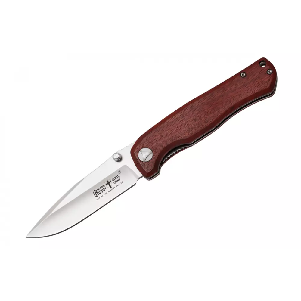 Ніж складаний Grand Way Е-101 -счасовий складаний ніж з клинком з високоякісної нержавіючої сталі, додатково легованої молібденом та ванадієм. Збалансований склад сталі марки 8Cr13MoV забезпечує тривалу роботу без заточування, хорошу стійкість до іржі та високу міцність. Недовгий, масивний і міцний клинок, загартований до 59 HRC, має гарний різ і чудову проникаючу здатність. Приємний тягар ножу надають міцні сталеві. плашки рукояті та масивна фурнітура, що скріплює клинок та рукоятку. Відкрита конструкція на гвинтах дозволяє легко регулювати ніж, ремонтувати та чистити. Міцному складаному ножу потрібен надійний замок – ndash; у цьому ножі це добре себе зарекомендував лінійний замок «Liner Lock». Замок надійний у своїй простоті, відпрацьований у виробництві і вкрай невибагливий. Накладки на рукояті виготовлені з красивого та міцного дерева. Деревина, що використовується для виготовлення накладок, пройшла спеціальну обробку і стійка до вологи, гниття та шкідників. Теплі на морозі та приємні на дотик накладки мають гарну текстуру і чудово виглядають. Особливий шарм ножу надає болстер з деревини іншого кольору і текстури. Шпенек на клинку, а також конструкція замка дозволяють відкривати і складати ніж одній рукою. Наявність кліпси забезпечує зручне постійне носіння ножа з собою. Невеликий, ергономічний, міцний, надійний та універсальний ніж.