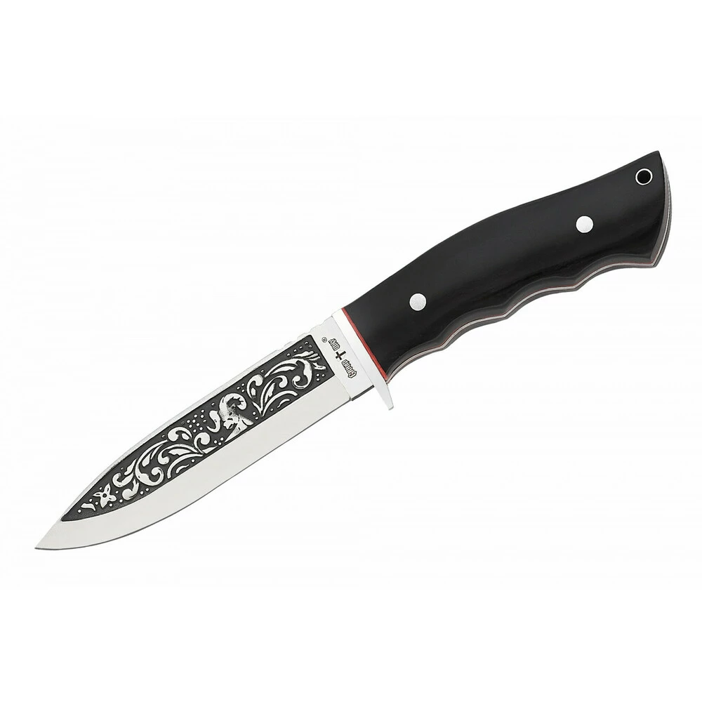 Досить великий упор для руки робить і без того зручну рукоятку ще безпечнішою, а через отвір в районі торцевої частини можна просмикнути темляк. Клінок ножа виготовлений з надійної нержавіючої сталі. марки 440С. Цей сплав добре пручається корозії та механічним впливам, довго тримає заточення. Drop Point). Вістря клинка акцентовано спрямоване вперед, що забезпечує ножу здатність потужно і точно колоти та протикати. Спуски увігнуті. На обусі є зручна насічка під великий палець. Ріжуча кромка закінчується тупою ділянкою &nash; рікассо, яке допоможе акуратно заточити ніж, не пошкодивши його болстер. ;– подарунковий, його клинок прикрашений красивим рельєфним малюнком, що зображує архара на тлі рослинного орнаменту. Можна сміливо сказати, що такі прикраси традиційні для мисливських ножів. Малюнок якісний і дуже підходить до дизайну Grand Way FB1578. Такий ніж справді може стати не тільки зручним та безпечним різальним інструментом мисливця, але й чудовим подарунком!