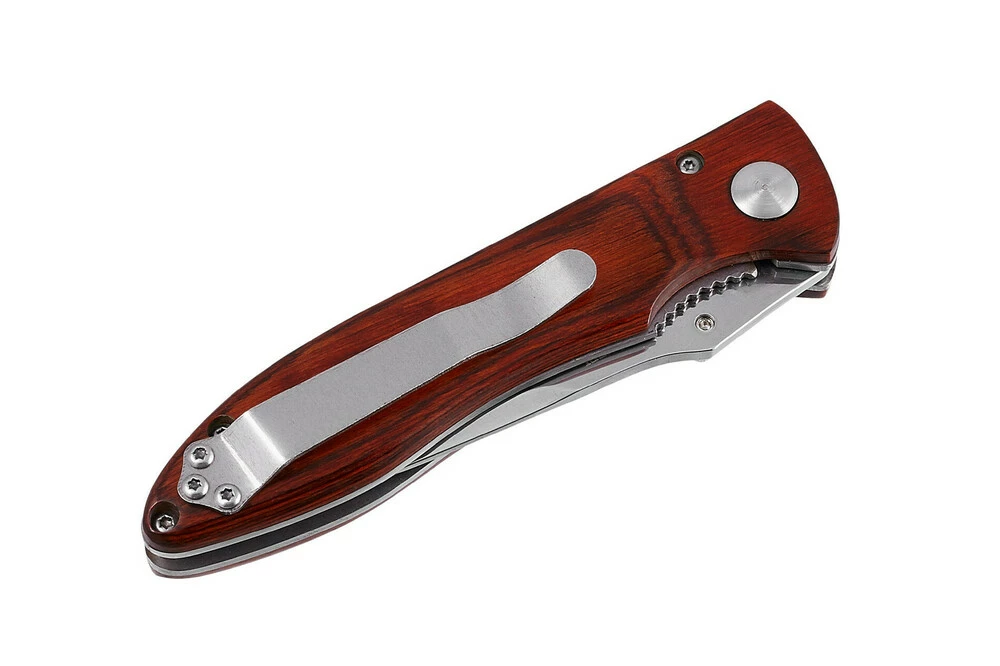 Замок ножа, що вже став класикою, невибагливий і відпрацьований у виробництві Liner Lock. Замок дуже надійний, дозволяє складати ніж однією рукою та не боїться бруду. Рукоятка ергономічної форми виготовлена з сталевих міцних пластин і зібрана на гвинтах. Накладки на рукоятку виготовлені з красивого та міцного листкового дерева, просоченого поліефірними смолами. Така деревина не боїться вологи і гниття, не морозить руку на холоді і чудово виглядає. Сама рукоятка досить повна для складаного ножа і дає. можливість прикласти велике навантаження під час роботи. Гарний полірований меч прекрасно поєднується з червоною деревиною рукояті, відмінно ріже і відкривається однією рукою завдяки спеціальному штифту. Для зручного постійного носіння на ножі передбачена кліпса, що знімається. Прекрасний складаний ніж, виготовлений в сучасному стилі з класичних матеріалів. span>