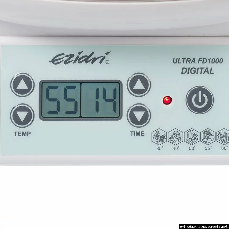 - таймер: 1 — 48 годин (по закінченні встановленого часу дегідратор автоматично переходить в режим 30 °С і продовжує працювати до вимкнення кнопки живлення)